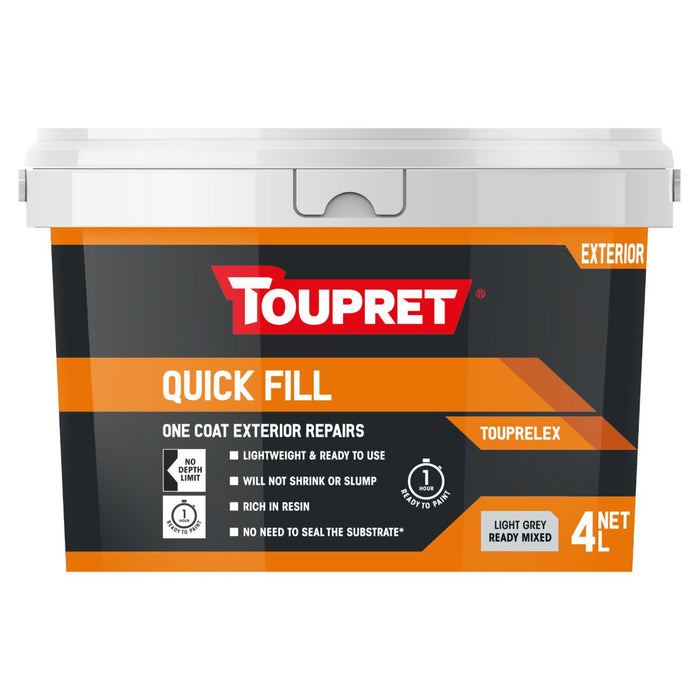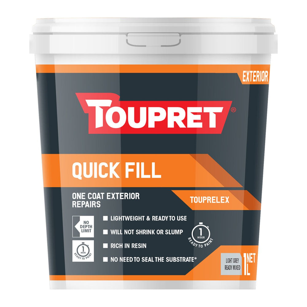ONE COAT EXTERIOR REPAIRS: EXTERIOR QUICK FILL is a ready-to-use lightweight filler that It offers a one coat fill with no shrinkage and can be painted over in 1 hour. It is rich in resin for added strength. Overcoat with all types of water-based masonry or conventional paints. If using polyurethane or epoxy solvent -based paints, first prime with a water-based exterior paint.